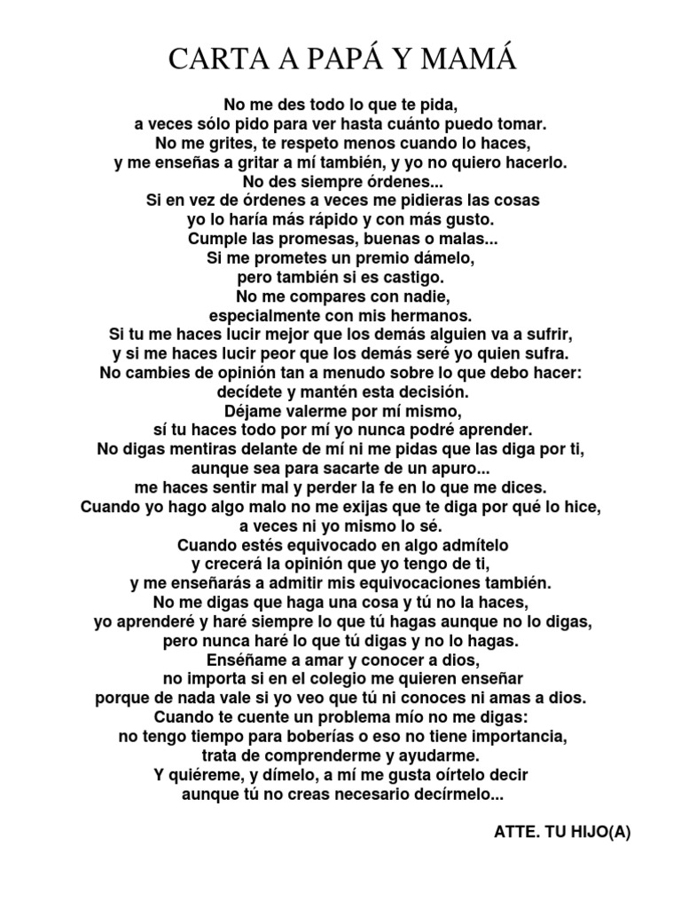 No sé que sería de mi vida sin mis padres. Carta abierta para padres en proceso de divorcio. Hola que tal bueno aquí dejo un tema muy especial para mi mama y mi papa últimamente me eh sentido asi espero lo disfruten es algo personal pero tal vez les. Por todo lo que te acabamos de comentar en el primer párrafo, vamos a mostrarte 7 modelos de carta para papá noel. Mama y papa mama y papa son los mejores padres del mundo los amo mucho aunque me regañen a mi hermana igual yo se que me quieren gracias que estoy con ustedes los amo, se que a veces les miento porque tengo miedo de.